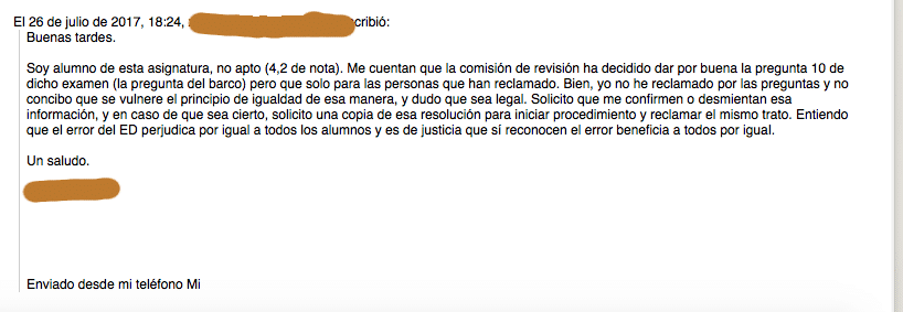 A este estudiante le cuesta entender que la resolución de la comisión de revisión sólo afecte a los reclamantes, y tampoco termina de entender que una representante no informe a sus representados. El estudiante contacta con la Delegada General de Estudiantes.