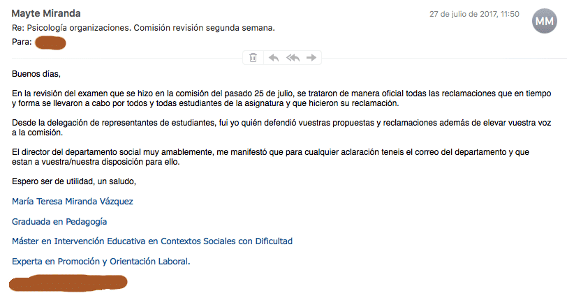 Mayte Miranda, Delegada en la comisión de revisión, había decidido informaros por teléfono de la situación.