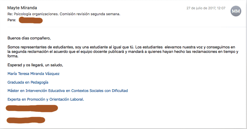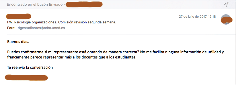 La «representante» María Teresa Miranda Vázquez contacta con el estudiante con objeto de dar las explicaciones que considere por teléfono, y hablan. El estudiante considera que la explicación de la representante es algo que concierte a tod@s los estudiantes matriculados en esa asignatura, graba la conversación telefónica y le pide permiso para compartir esa información con el resto de compañeros, pero la «representante» no lo entiende y monta una escena. A continuación la Delegada General de Estudiantes de la UNED envía un correo a una alumna donde le dice textualmente lo siguiente: